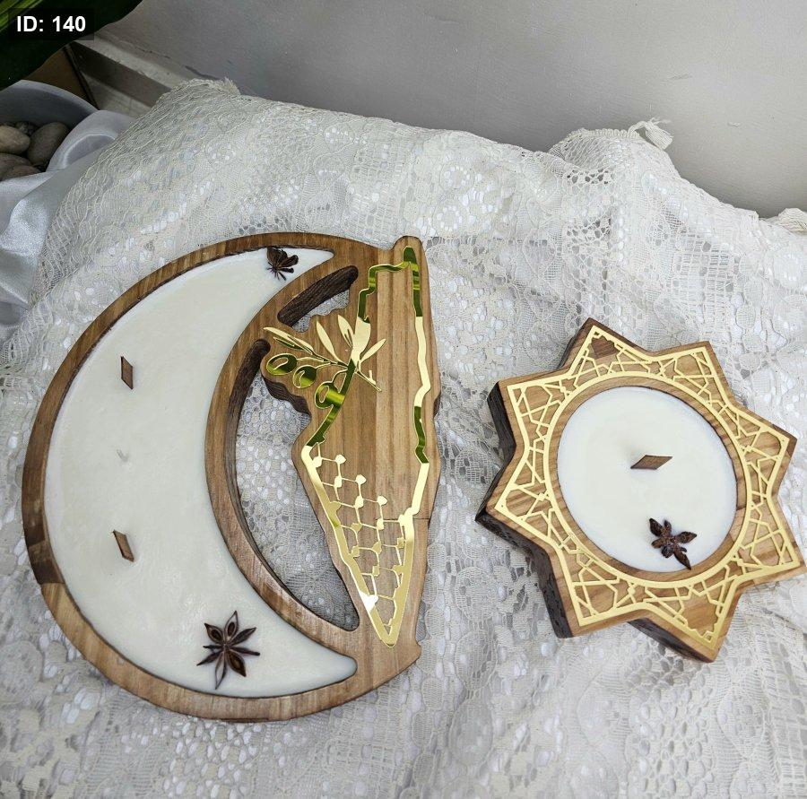 شمعة هلال رمضان خشب مزين بالاكريلك مع شكل خارطة فلسطين وزيتون